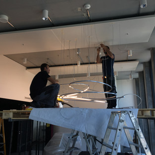 Il s'agit d'une composition lumineuse profil suspendu avec éclairage double latéral. L'installation comprend un cintrage des profilés de plusieurs types.